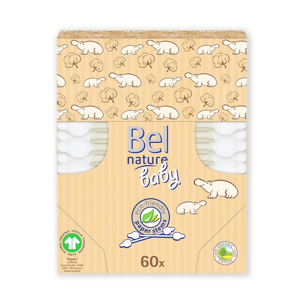 Bel Nature Betisoare de Urechi pentru copii cu stop. Un pachet conține 56 de betisoare de bumbac din bumbac organic 100%. Tampoanele de bumbac de siguranță au un ax de hârtie și sunt potrivite în special pentru utilizare pe bebeluși și copii mici.
