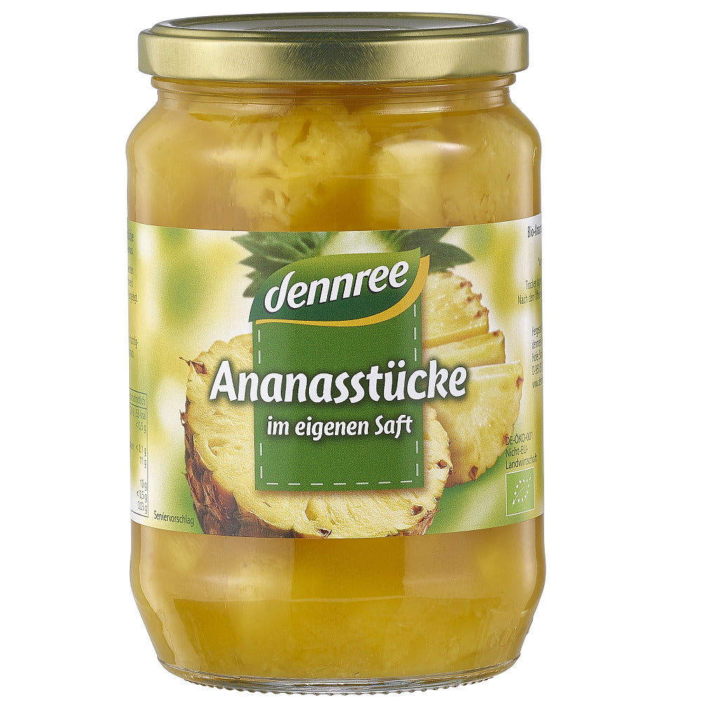 Bucățile de ananas organic oferă plăcere pură. Pentru bucățile de ananas dennree, ananasul organic copt la soare este procesat ușor și conservat în propriul suc. Sunt ideale ca topping pentru prăjituri și tarte, precum și pentru cocktailuri și deserturi, dar sunt și delicioase ca atare. Bucurați-vă de gustul fructat-exotic.