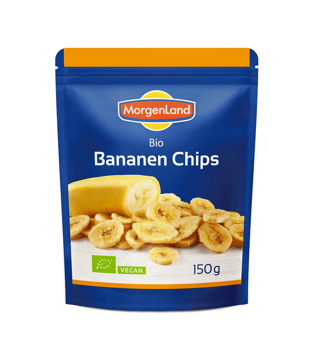 Pentru aceste chipsuri de banane MorgenLand, bananele coapte sunt curățate și tăiate, apoi prăjite în ulei de cocos și apoi scufundate într-o soluție de zahăr crud din trestie și, în final, uscate.