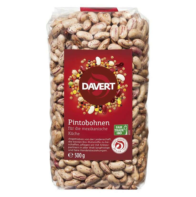 Fasolea Pinto, produsa in China, se mai numește și fasole-prepeliță sau fasole-pestrita din cauza petelor ei reprezentative. Acest sortiment de fasole Pinto bio al producatorului german Davert provine din agricultura ecologica si din comertul echitabil Fair Trade.