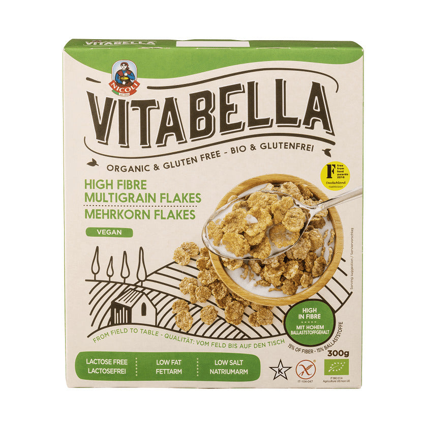 Bio Fulgi Multigrain cu Fibre Vegan Fara Gluten Vitabella Cerealien 300 g - fiecare zi incepe perfect cu o portie sanatoasa de fibre!