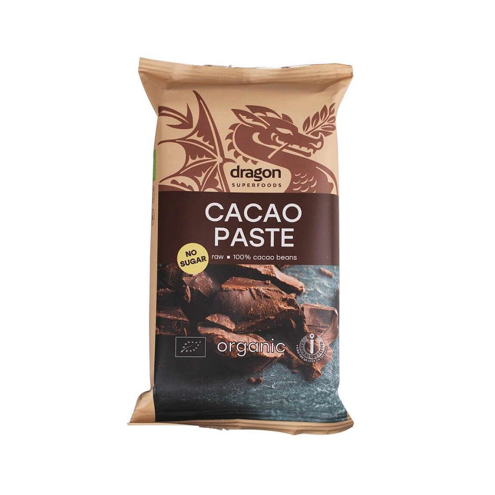 Pasta de cacao peruană de la Dragon Superfoods este făcută din boabe de cacao întregi, presate la rece. Are o textură netedă, cremoasă și un gust bogat de unt. Pasta de cacao are toate calitățile nutritive ale boabelor de cacao. Una dintre cele mai bogate surse de magneziu din natură, o sursă de fier și fibre.