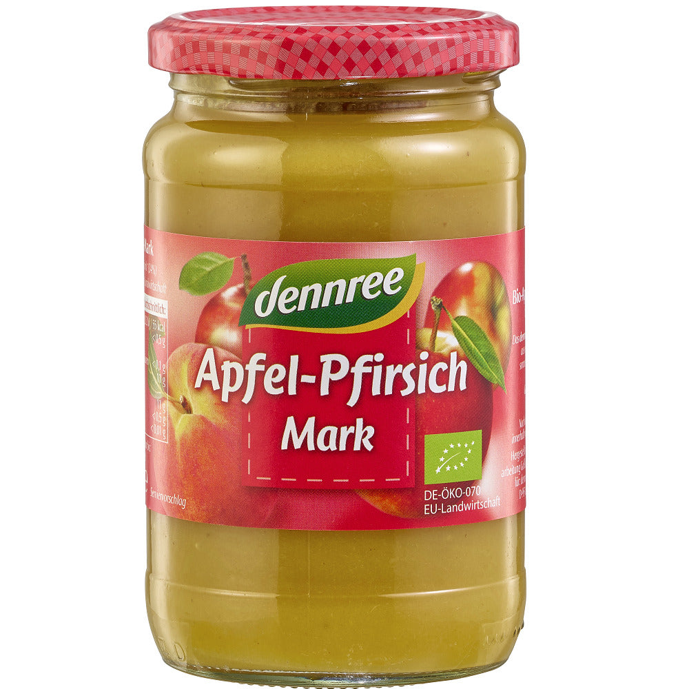Piureul organic de măr și piersici oferă plăcere pură.Piureul de măr și piersică Dennree este preparat cu grijă din mere organice proaspăt recoltate și piersici organice stropite de soare. Bucurați-vă de gustul fructat, delicat.
