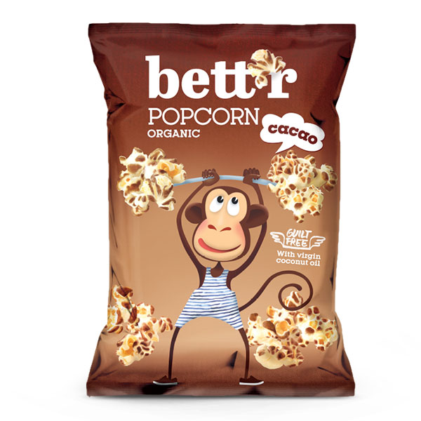 Bio popcorn cu cacao Bett'r este o experienta frumoasa! Super plus pentru orice distractie. Aroma lor irezistibila este din nou realizata fara aditivi nocivi gratie uleiului de cocos bio (in loc de uleiul de palmier folosit in mod obisnuit). Se utilizeaza tehnologia traditionala de gatit cu continut scazut de grasimi. Consumati fara remuscari!