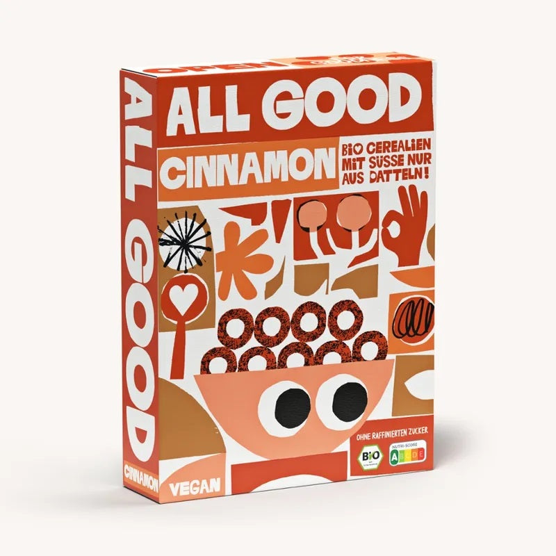 Vă prezentăm: ALL GOOD – Bunătatea Cerealelor Bio. Crocant, gustos și dulce (dar nu prea dulce), complet vegan și bineînțeles organic. Zahărul rafinat, aromele artificiale, precum și conservanții și aditivii trebuie să rămână afară. Înlocuim grâul și porumbul cu ovăz și speltă. Și superputerea noastră vine de la curmale. Oferă buclelor gustul lor dulce, fructat și crocant.