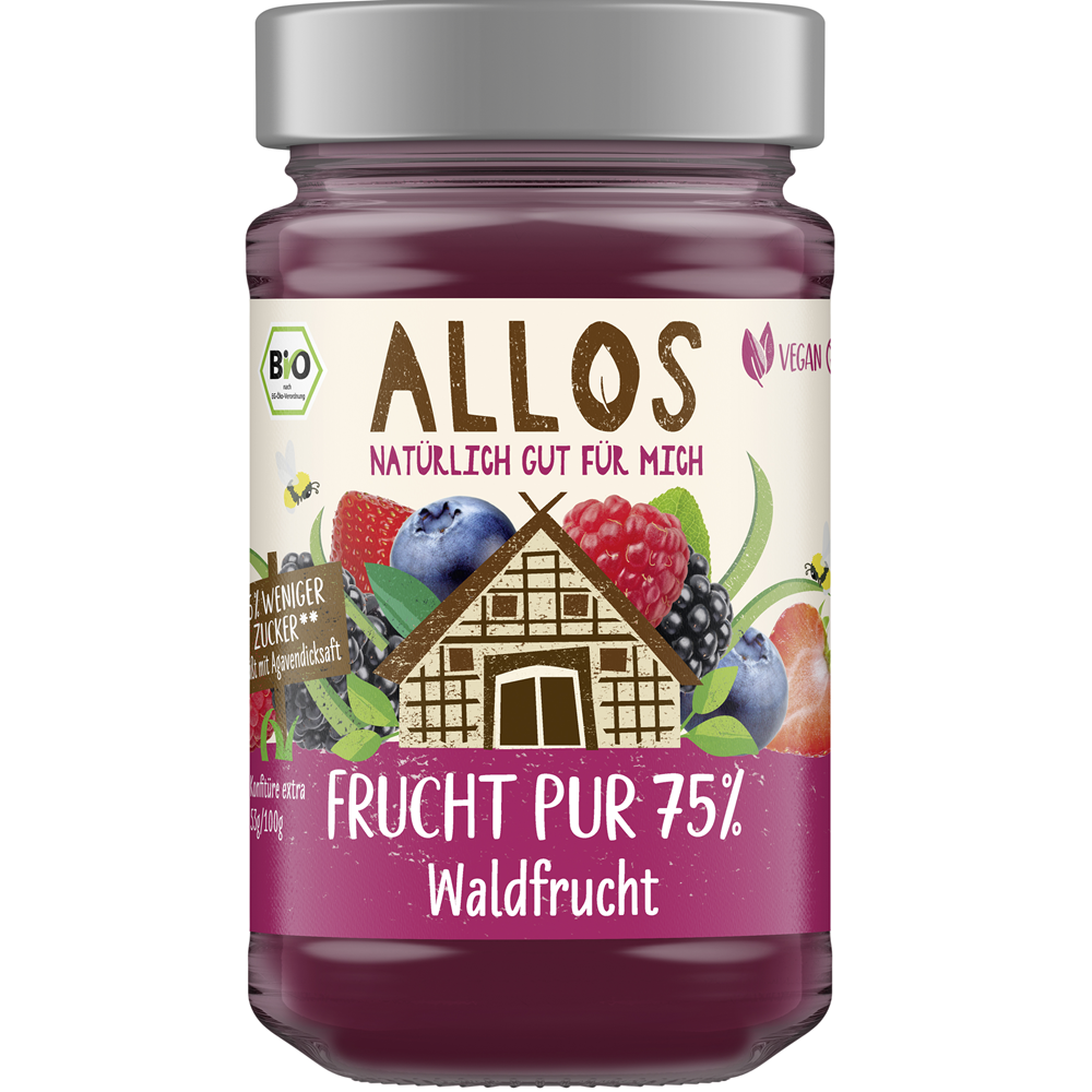 Compoziția clasică de fructe de pădure complet coapte, cum ar fi mure, căpșuni, zmeură, mure,afine și suc de soc îi conferă acestui fruct întins nota sa profundă, plină de corp. Rețeta deosebit de echilibrată și delicioasă a tartinelor Frucht Pur 75% impresionează cu un conținut de fructe de 75%.