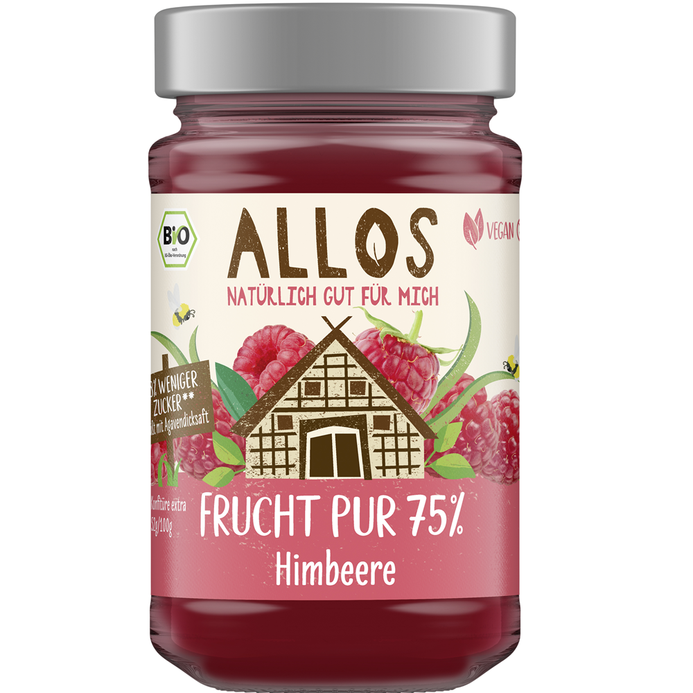 Pentru Allos Frucht Pur 75%, zmeura suculentă și dulce este procesată deosebit de delicat, astfel încât să se păstreze o aromă intensă de zmeură. Rețeta deosebit de echilibrată și delicioasă a tartinelor Frucht Pur 75% impresionează cu un conținut de fructe de 75%.