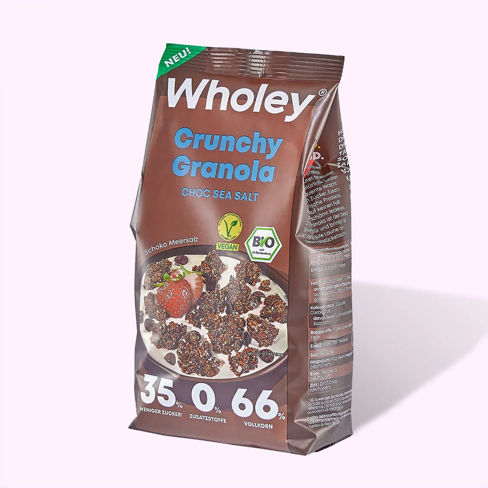 Preferi să începi ziua dulce? Granola Bio Vegana cu Ciocolata si Sare de Mare Wholey facuta din fulgi organici de ovaz si spelta bogate in fibre in combinatie cu ciocolata neagra, cacao si un praf de scortisoara iti indulcesc dimineata intr-un mod complet natural – fara zahar rafinat sau aditivi.