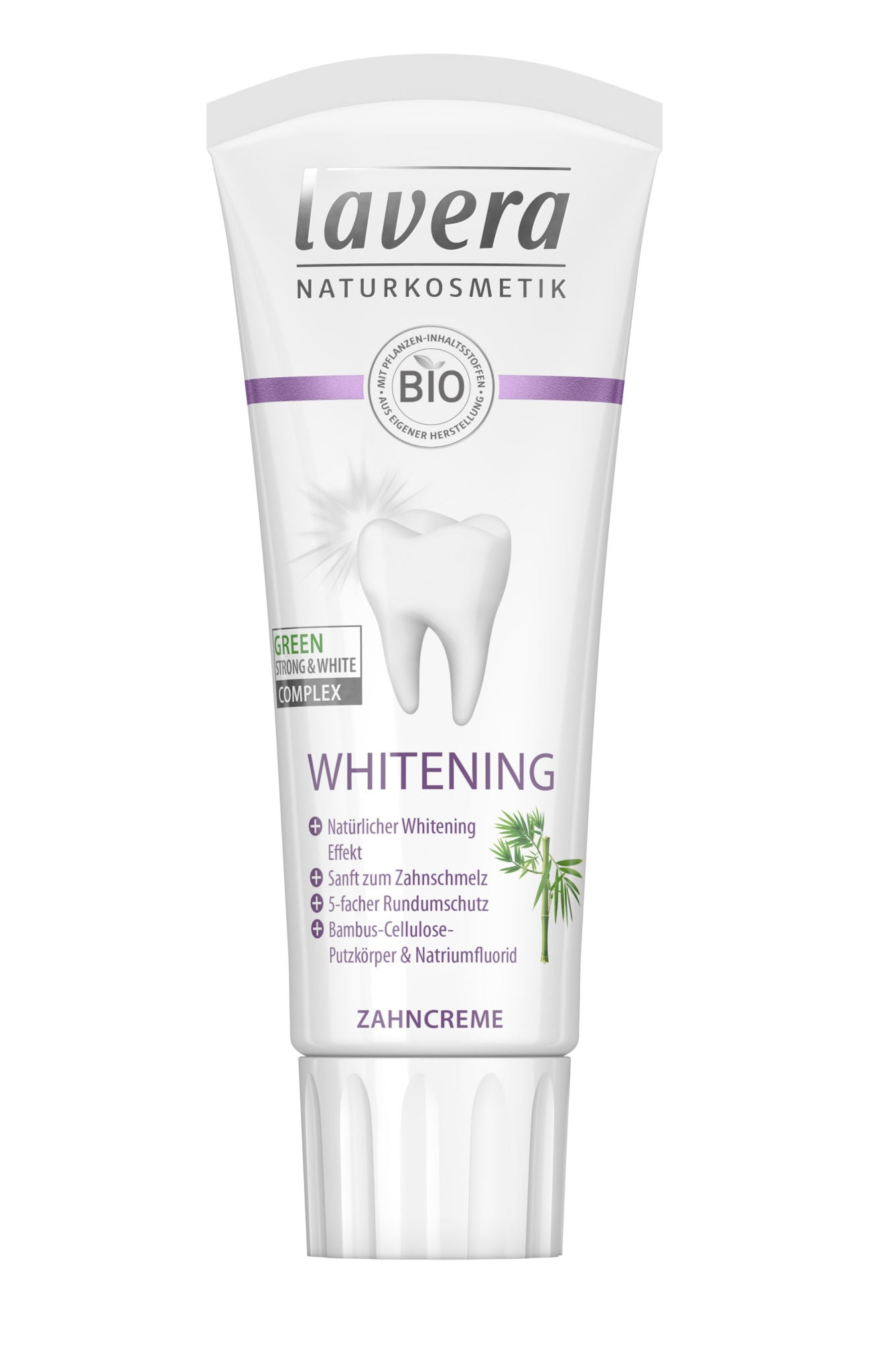COMPLEXUL VERDE STRONG & WHITE: Echipa de cercetare Lavera Naturkosmetik a dezvoltat o formula extrem de eficienta de pasta de dinti pentru albire care intareste dintii si contine o compozitie de ingrediente active exclusiv, bazata pe particule de curatare a celulozei de bambus, care reduce in mod natural petele si este blanda pe smaltul dintilor.