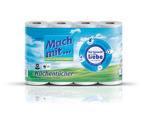 Folosind prosoape de bucatarie Mach mit realizate din fibre 100% reciclate, puteti face o contributie mica fata de mediul inconjurator, pe de alta parte puteti utiliza servetelele de bucatarie exact in cantitatea de care aveti nevoie fara a pierde nimic. Prosoapele noastre de bucatarie sunt decorate cu "Angel Blue" si poarta logo-ul WWF.