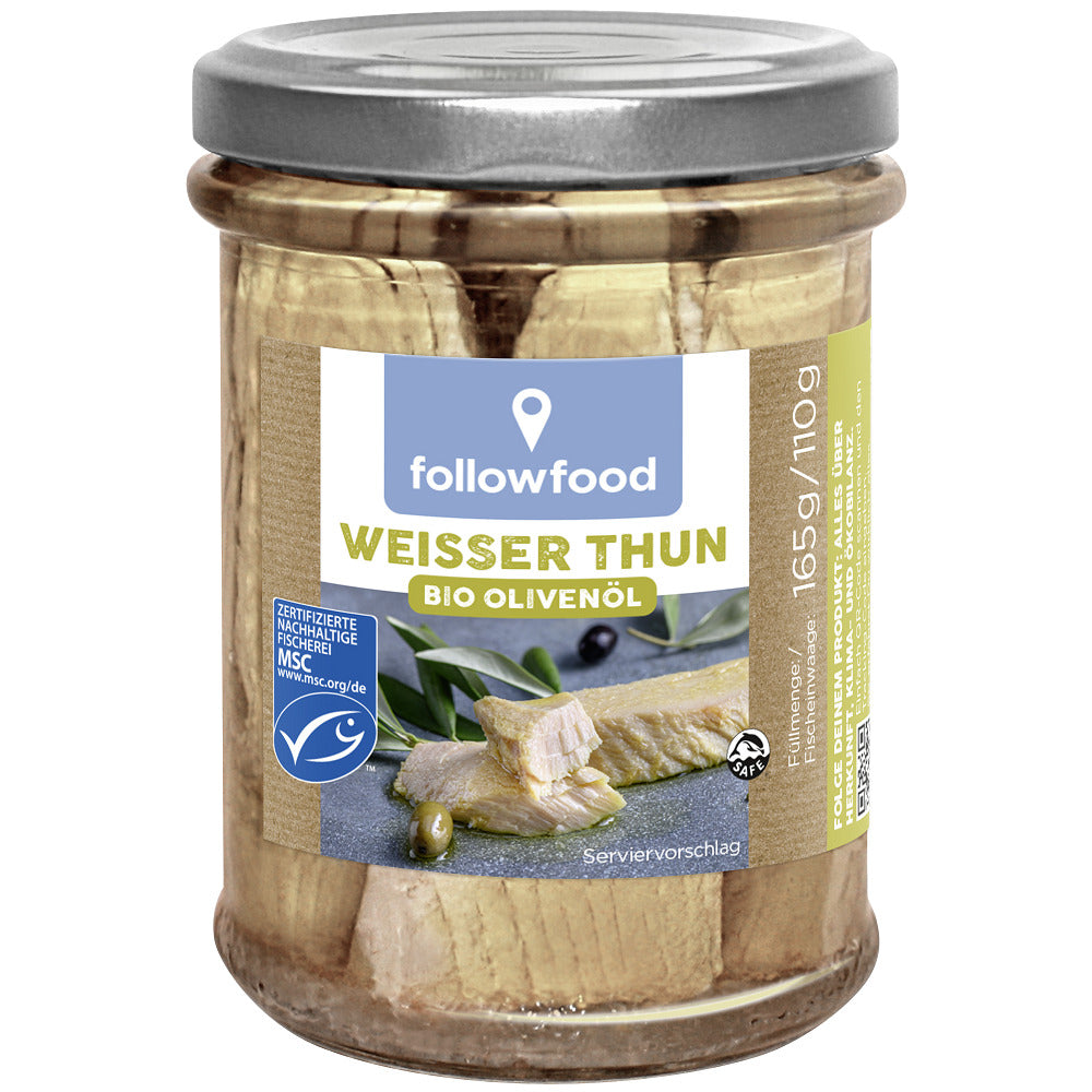 Tonul nostru alb followfood este prins în mod durabil cu cârlige și paragate și are cel mai bun gust ca topping pe salată sau cu antipasti. Uleiul de măsline din „Tunfisch im Glas” provine din cultură organică controlată. Pur și simplu bucurați-vă și salvați mările în același timp.